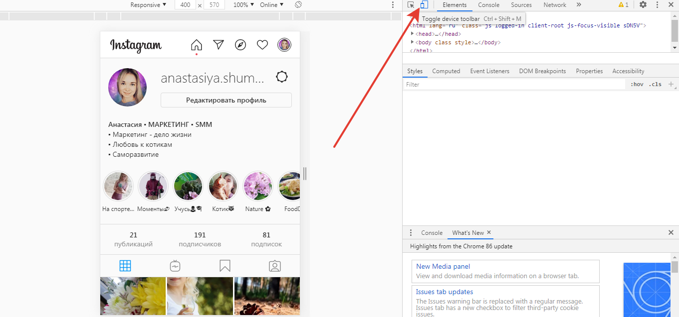 4. Справа откроется панель, в верхней части которой появится значок Toogle device toolbar в виде двух пересекающихся прямоугольников разных размеров. Нажмите на него или наберите на клавиатуре Ctrl+Shift+M.
