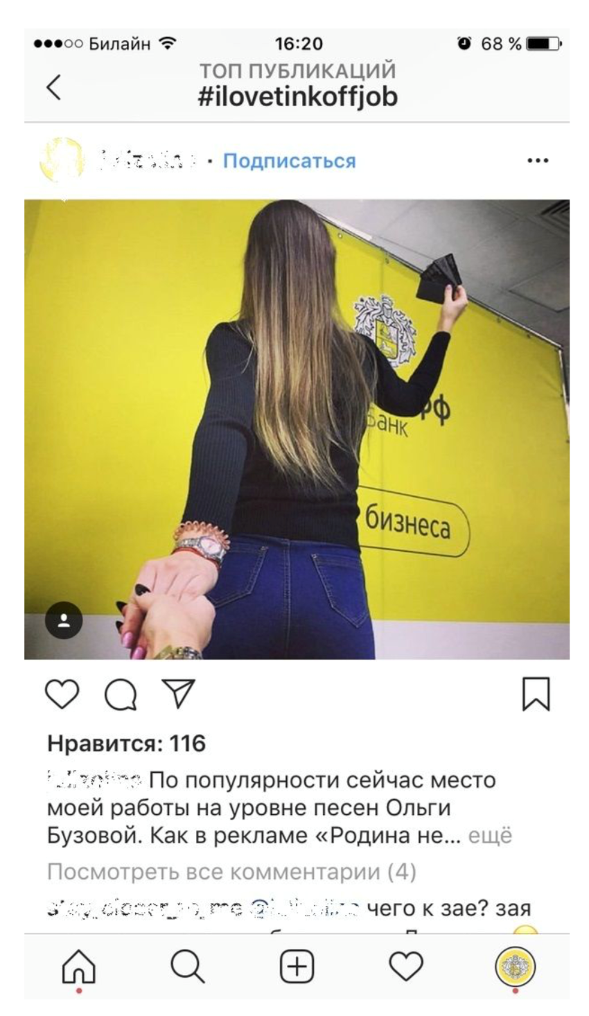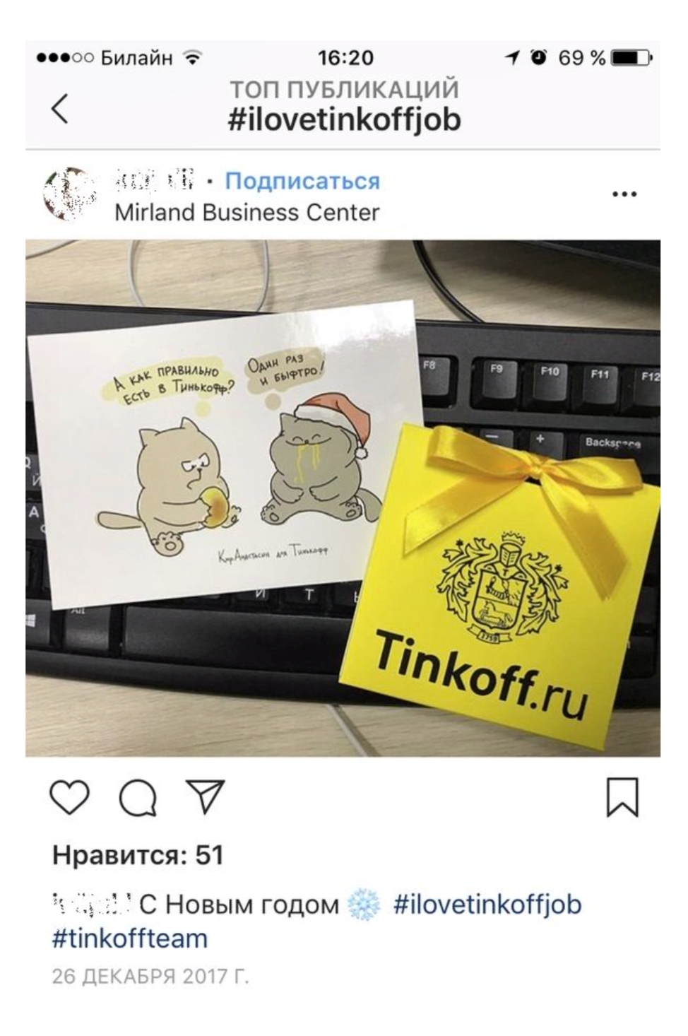 Создали фотоконкурс, который проводился от аккаунта среди действующих работников банка. То есть интегрировали их активность по внутреннему hr посредством рассылки с соц.сетями. Также завели и прокачали среди сотрудников новый брендированный хештег #ilovetinkoffjob Теперь им с удовольствием пользуются не только в рамках конкурса за брендированные призы, но и когда хотят поделиться эмоциями от любимой работы:)