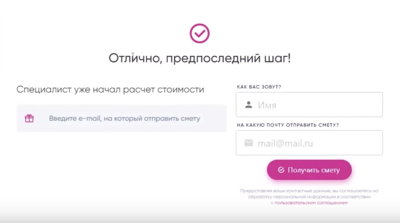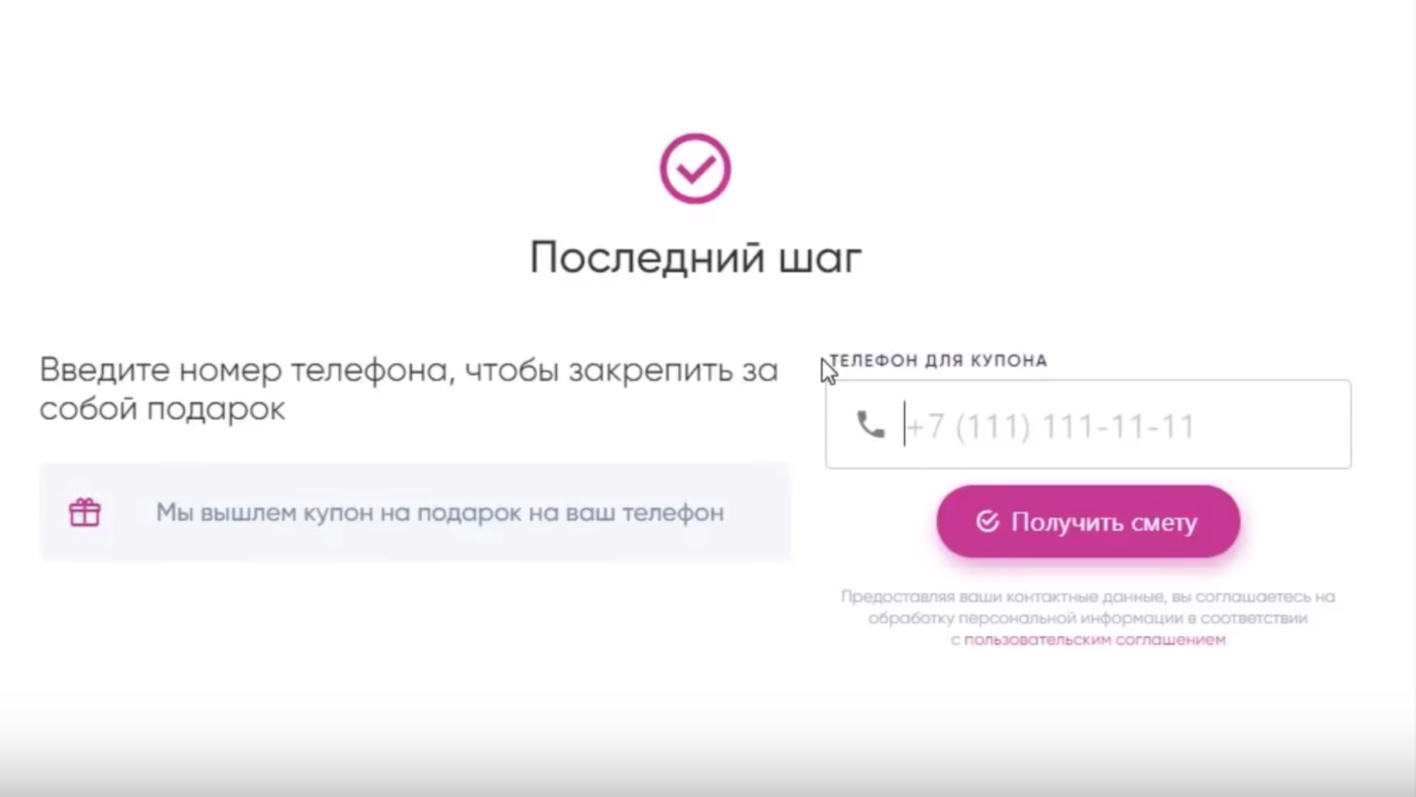 Делайте форму максимально простой для заполнения. Не берите лишних данных (ИНН, фамилия дедушки, номер свидетельства о рождении). Возьмите только телефон. В большинстве случаев вам даже e-mail не нужен будет. Не мучайте пользователя, ведь он уже сделал огромную работу и прошел квиз до конца. Порадуйте его и наградите за усидчивость.